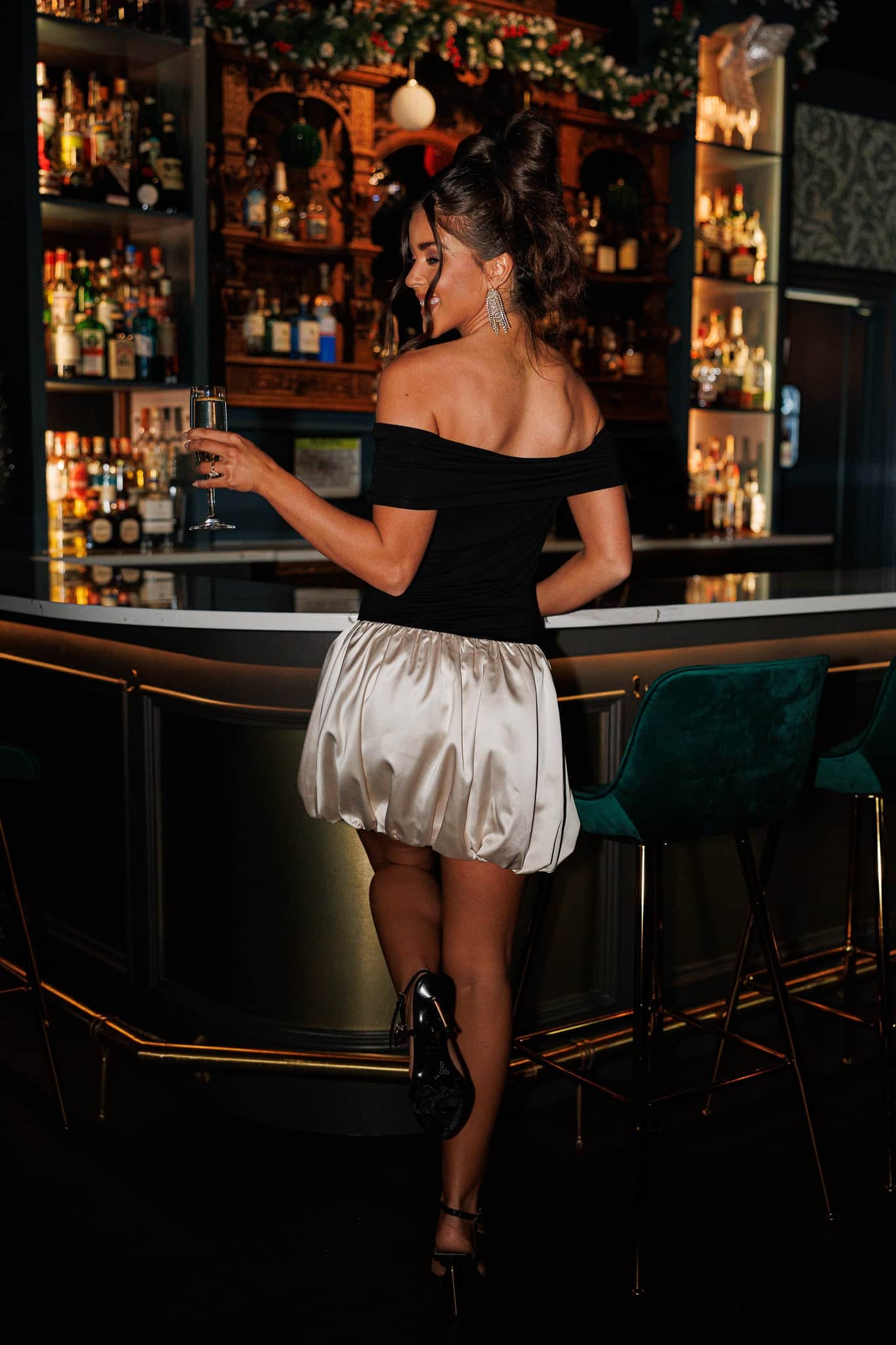 This playful off-the-shoulder mini dress features a luxurious satin-like fabric that adds a touch of shine and elegance. Its unique bubble skirt creates a fun, voluminous silhouette perfect for parties or special occasions. Comfortable and stylish, this dress lets you flaunt your shoulders while enjoying a flirty, youthful look.