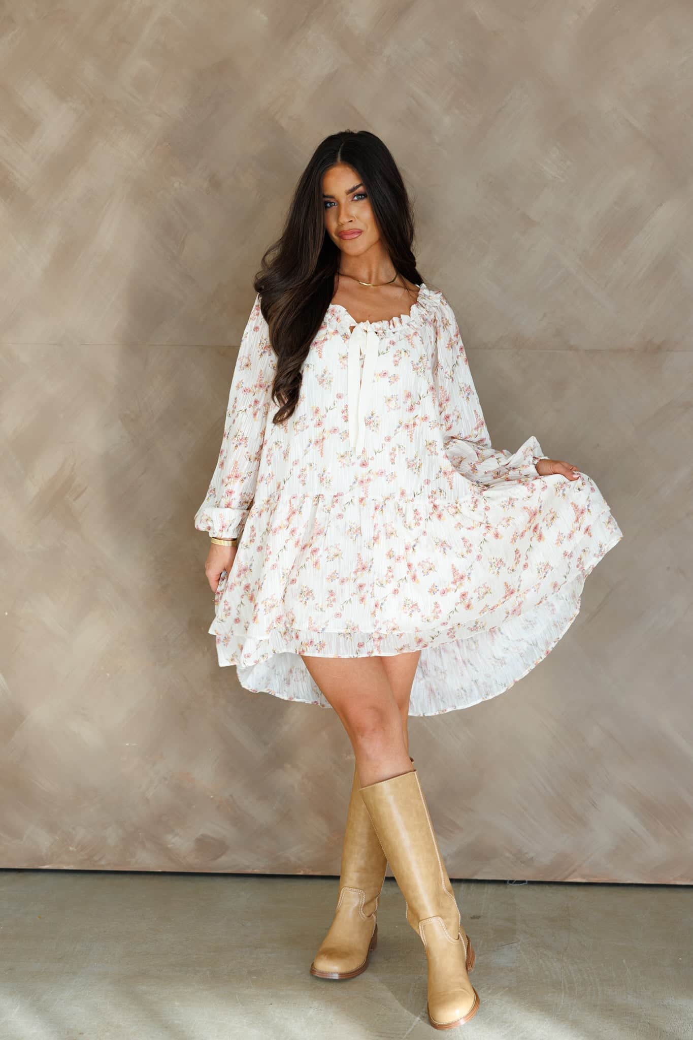 Twirl into the spotlight in this charming floral mini dress, designed with a playful high-low silhouette that keeps things fun and flirty. The delicate petal-inspired details add a touch of romance, while the flared cut gives you effortless movement and a flattering shape. Perfect for date nights, casual outings, or whenever you want to feel a little extra fabulous. This dress is your go-to piece for looking put-together without trying too hard.