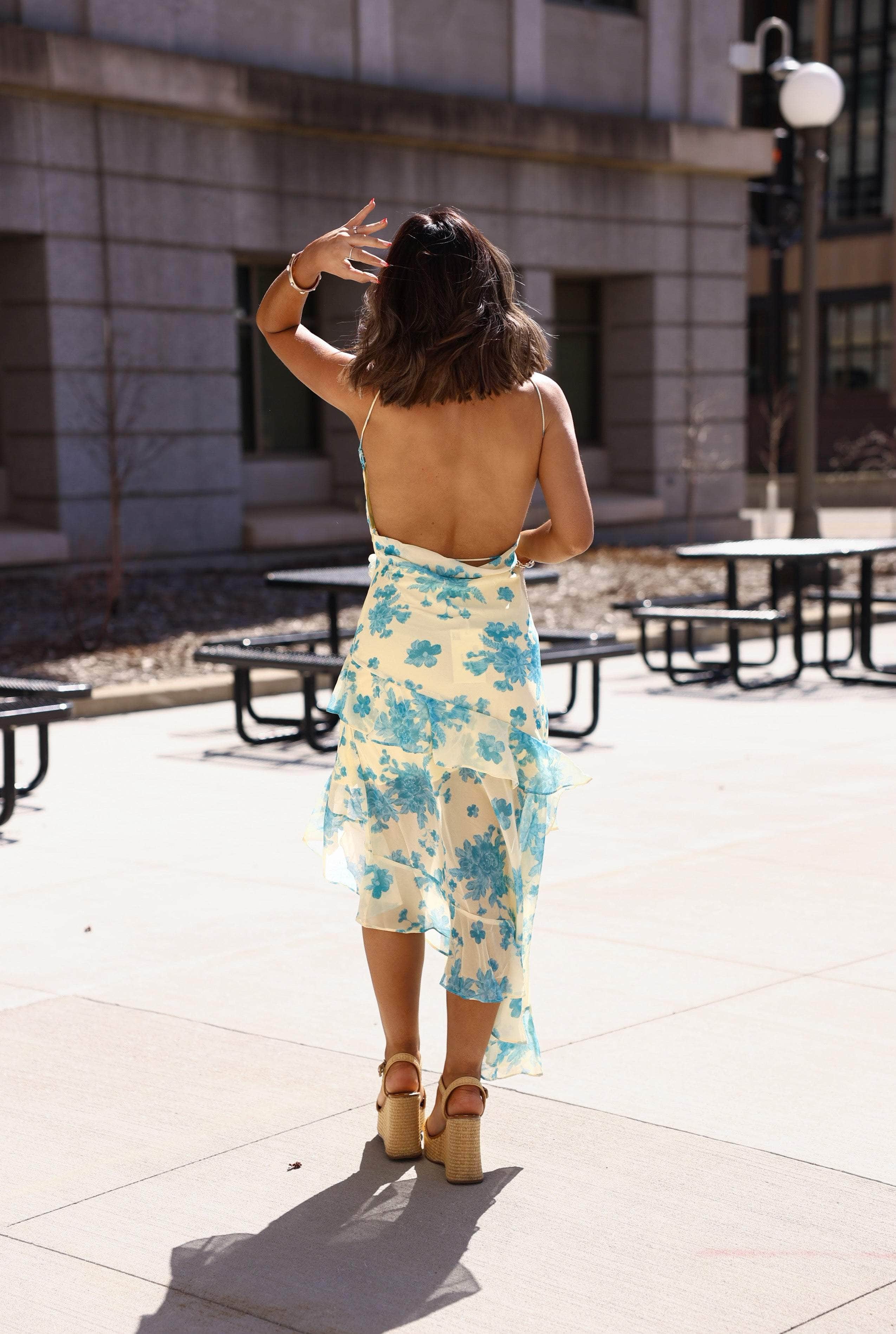 Enhance your summer wardrobe with our Lemon Love Song Dress. This charming dress features adjustable straps and open back detail with an adjustable strap across, providing a perfect fit. The ruffle hem and slit on the side add a touch of elegance, while the lined design offers comfort. Complete your look with the removable flower pin for added detail.