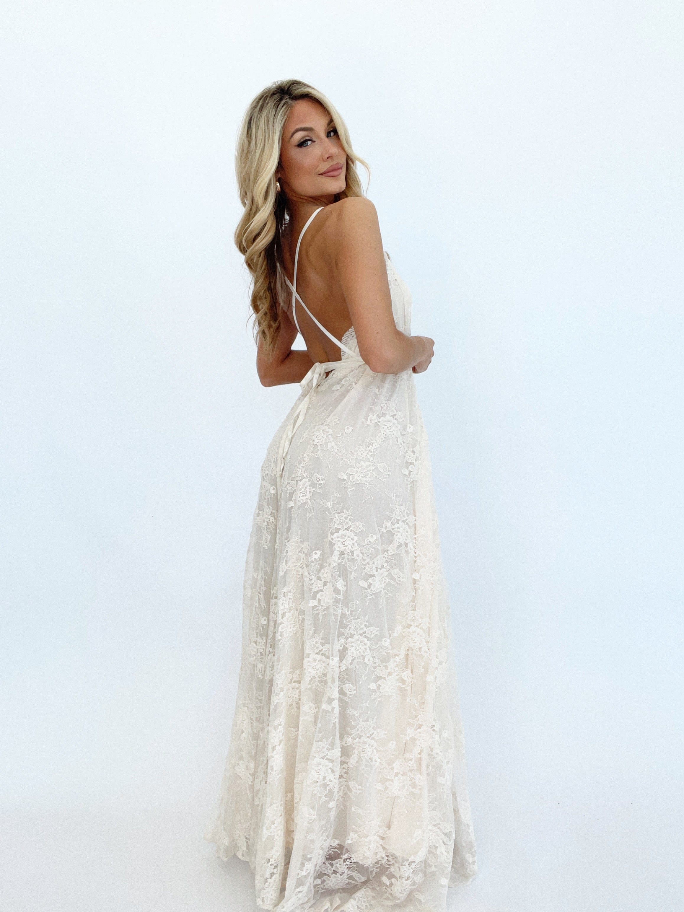 Get ready to turn heads in our Love Ties Maxi Dress. The plunging v neckline and sheer mesh lace overlay add a sultry touch, while the soft inner lining and stretchy, flowy maxi fit provide comfort and elegance. Featuring a side slit detail and back tie detail with an open back, this dress is perfect for dinner, drinks, or a date night. Elevate your summer formal wardrobe with this elevated piece.