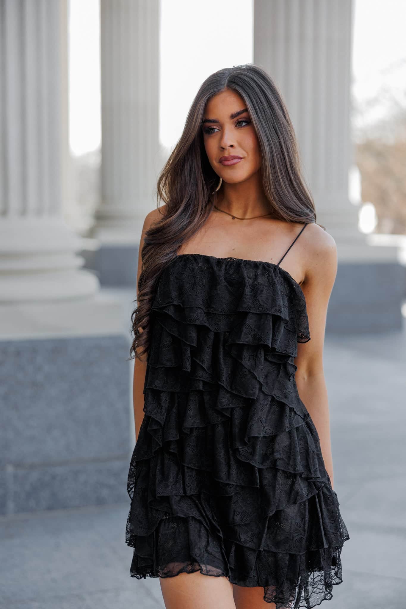 Twirl into the spotlight in this enchanting lace ruffle tiered mini dress. Delicate layered ruffles create romantic movement with every step, while intricate lace detailing adds an undeniably feminine touch. The charming tie-back design cinches perfectly at the waist, offering both comfort and a flattering silhouette. Perfect for date nights, celebrations, or whenever you want to feel effortlessly chic and utterly irresistible.
