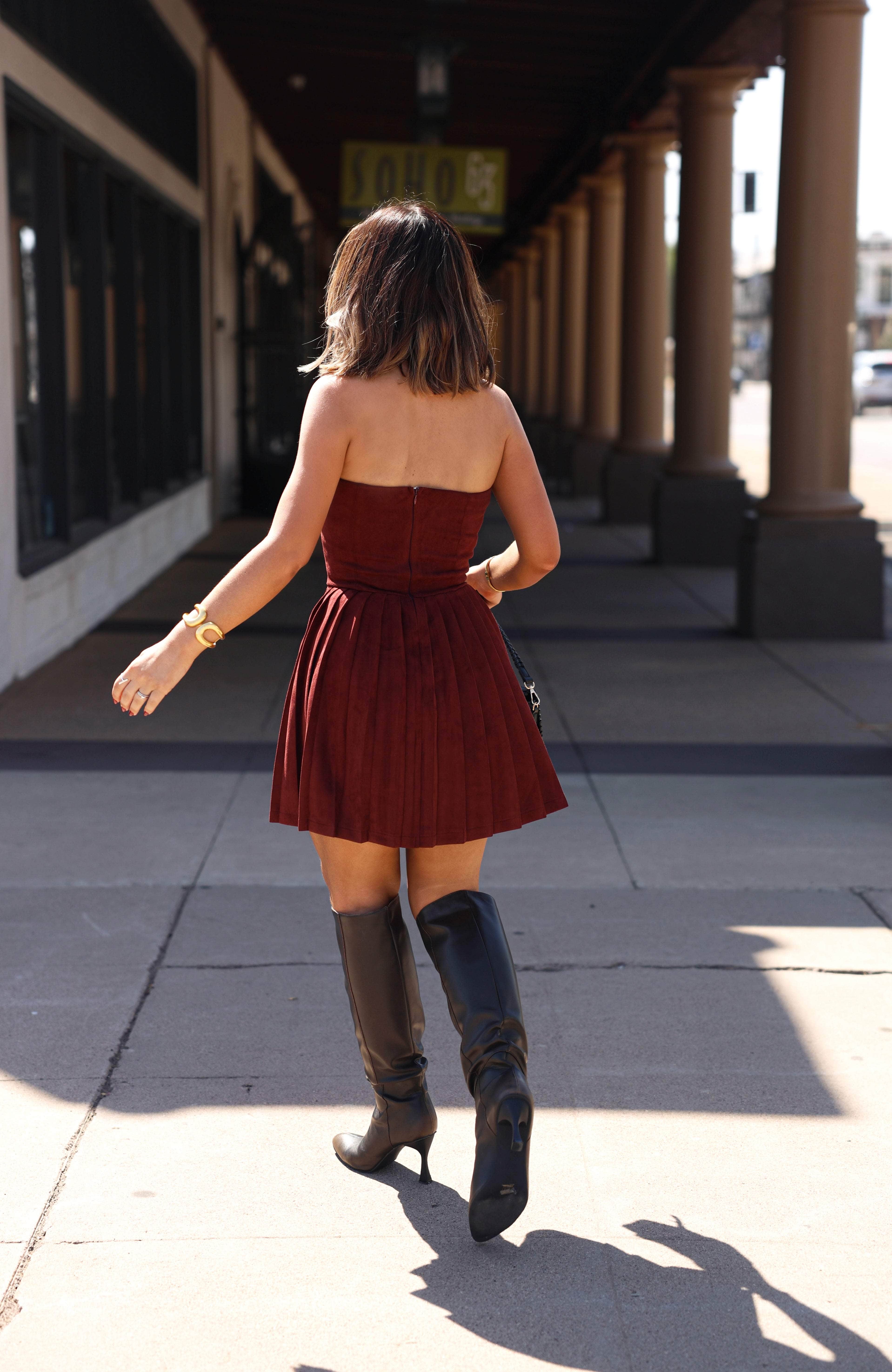 The Mulled Wine Suede Dress is a must-have for your wardrobe. Made with soft and luxurious suede, this mini dress features a flattering pleated skirt that adds movement and dimension to your look. Perfect for a night out or dressed down for a casual day, this dress will keep you stylish and comfortable.