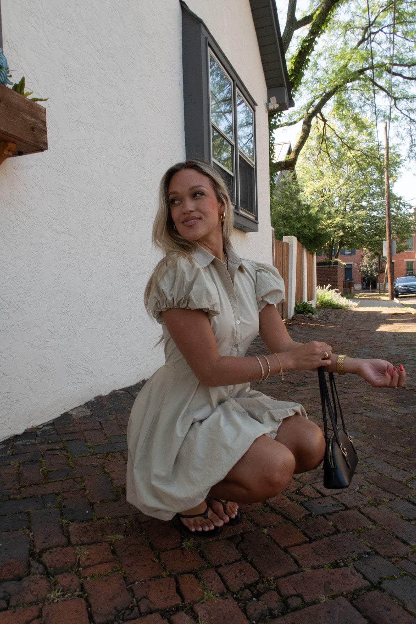 Soft cotton blend button-up dress with a collared neckline, puff sleeves, and a puff hemline. Designed with an A-line silhouette and side pockets for added convenience. An easy go-to for everyday or casual outings.