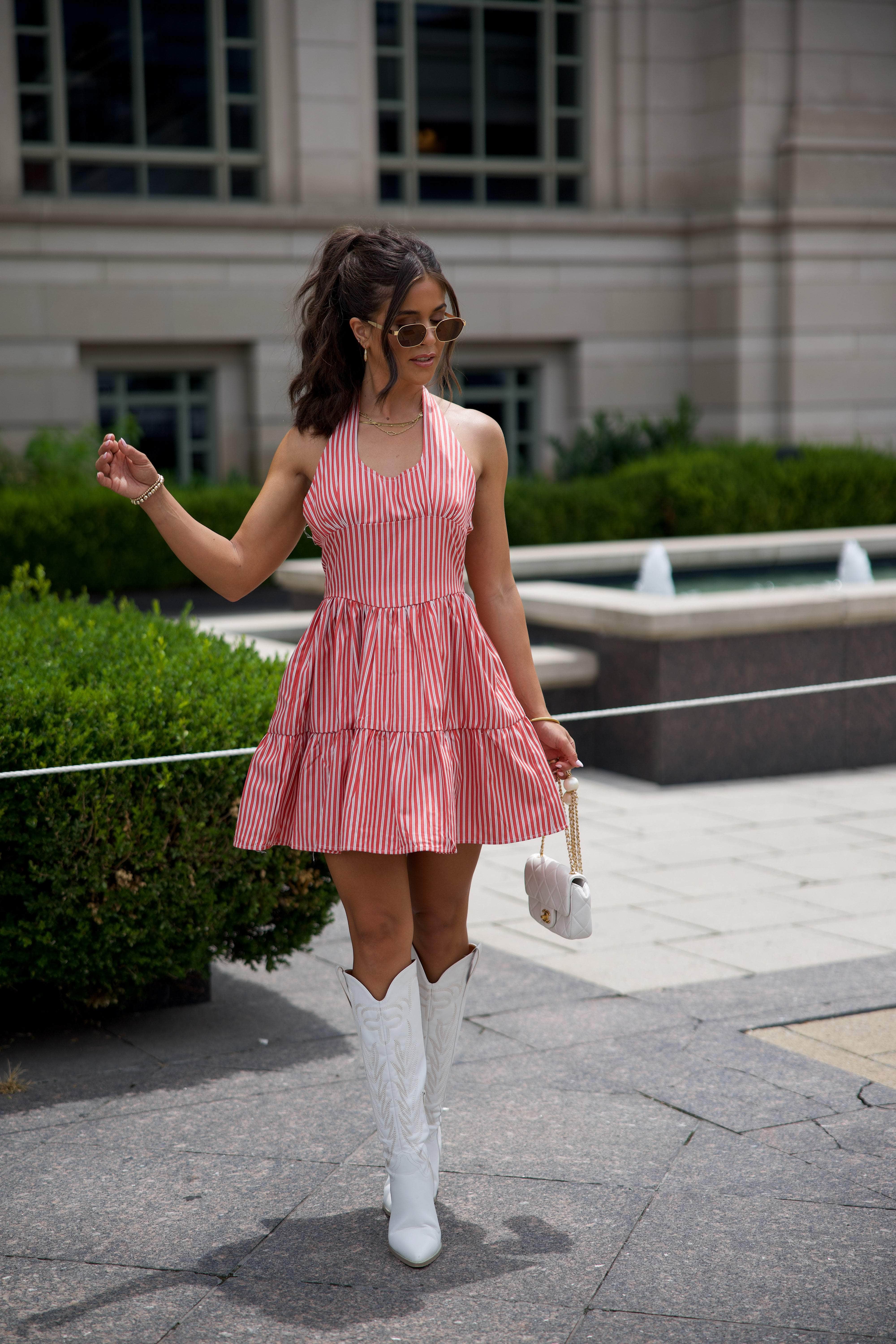 Easy, breezy, and made for warm-weather days, this soft halter mini dress features a round neckline and an adjustable tie at the back of the neck for a comfortable fit. The striped fabric adds subtle texture, while faux buttons along the back bring a charming little detail. Finished with delicate ruffle seam accents, it’s an effortless piece you’ll reach for again and again.